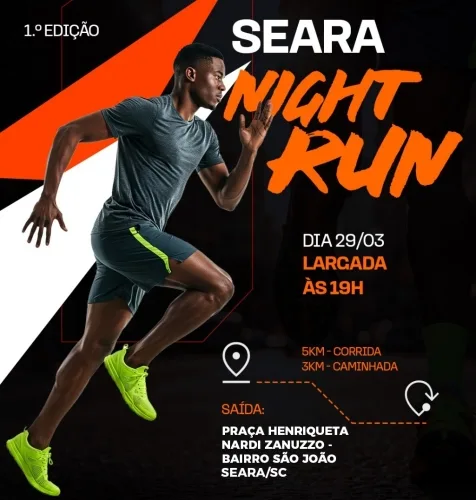 Vem aí a 1ª Seara Night Run, a Corrida Noturna de Seara. Será no dia 29 de março com largada na praça do Bairro Industrial às 19h.