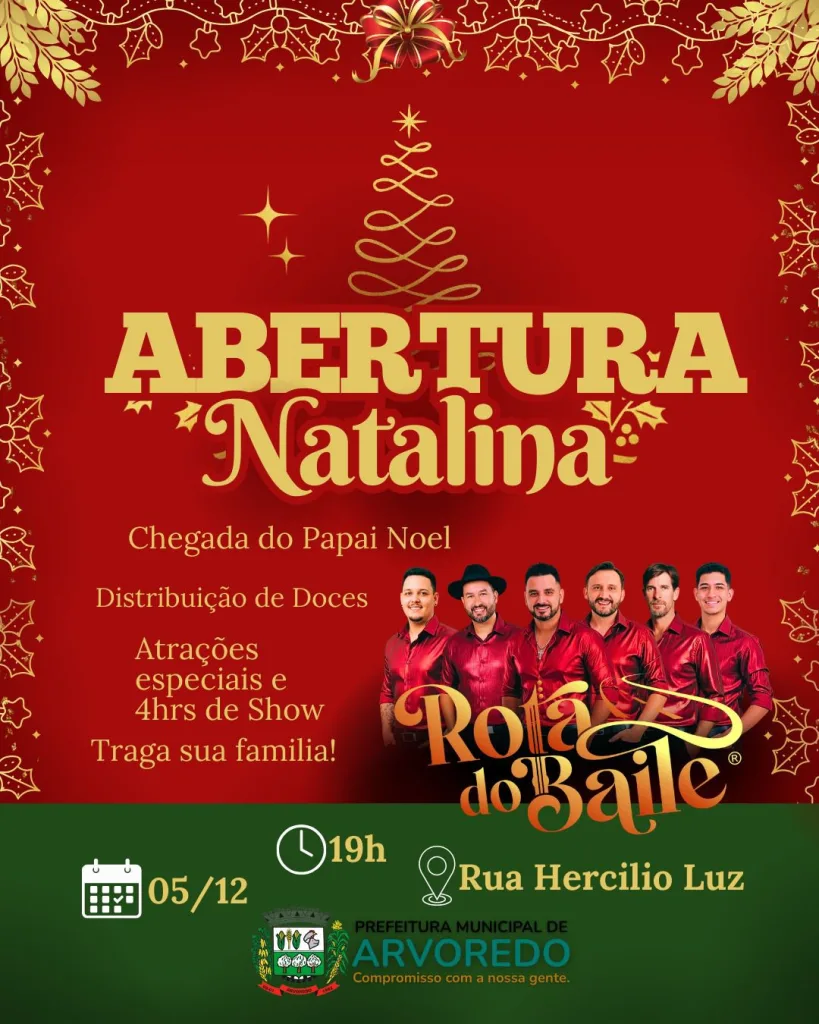 Nesta sexta-feira, 5 de dezembro, será realizada a Abertura Natalina no município de Arvoredo. A programação acontece na Rua Hercílio Luz, em frente ao Centro Comunitário. A partir das 19h, haverá show com a Banda Rota do Baile, chegada do Papai Noel, distribuição de doces para as crianças e várias atrações especiais. O evento conta com o apoio da CDL.