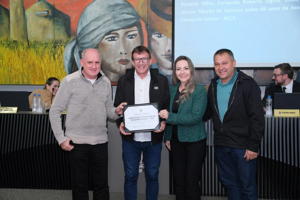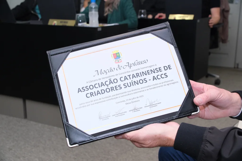 Na sessão desta quarta-feira, 23, a Câmara de Vereadores de Concórdia homenageou a Associação Catarinense de Criadores de Suínos (ACCS) com uma Moção de Aplauso pelos 66 anos de fundação da entidade. A honraria foi entregue ao presidente da ACCS, Losivanio Luiz de Lorenzi, que também usou a tribuna para destacar a importância do setor suinícola e do papel da associação no desenvolvimento da cadeia produtiva em Santa Catarina e no Brasil.