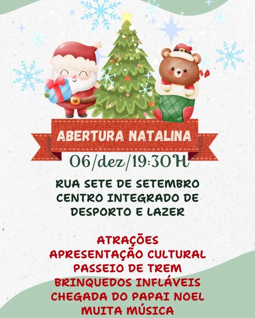 A programação natalina em Arvoredo acontecerá nesta sexta-feira, 6, às 19h30, no Centro Integrado de Desporto e Lazer. Haverá o acendimento das luzes de Natal com a chegada do Papai Noel e apresentações culturais de dança dos alunos das oficinas de cultura do CRAS. Também, o trenzinho e brinquedos infláveis para as crianças, com distribuição de lanche e refrigerante.
