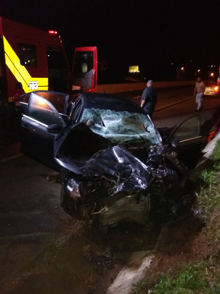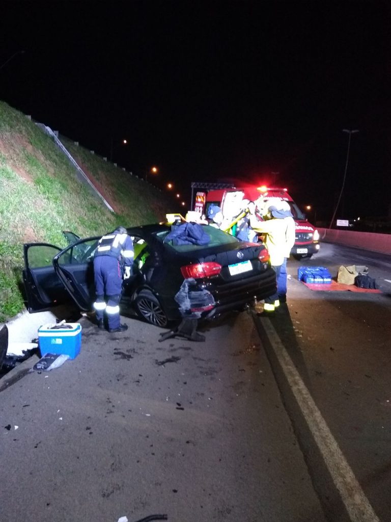Conforme os bombeiros, após colidir em um caminhão furgão, um Volkswagen/Jetta se chocou com a mureta de proteção da rodovia. Duas pessoas estavam no veículo e ficaram feridas. Segundo os socorristas, um homem apresentou ferimentos com gravidade leve e uma mulher tinha lesões de gravidade média (fratura exposta na perna esquerda e ferimentos na face).