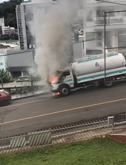 Um incêndio ocorreu em um caminhão da Casan. Depois o veículo, ainda com chamas, se desgovernou e colidiu em automóveis estacionados.