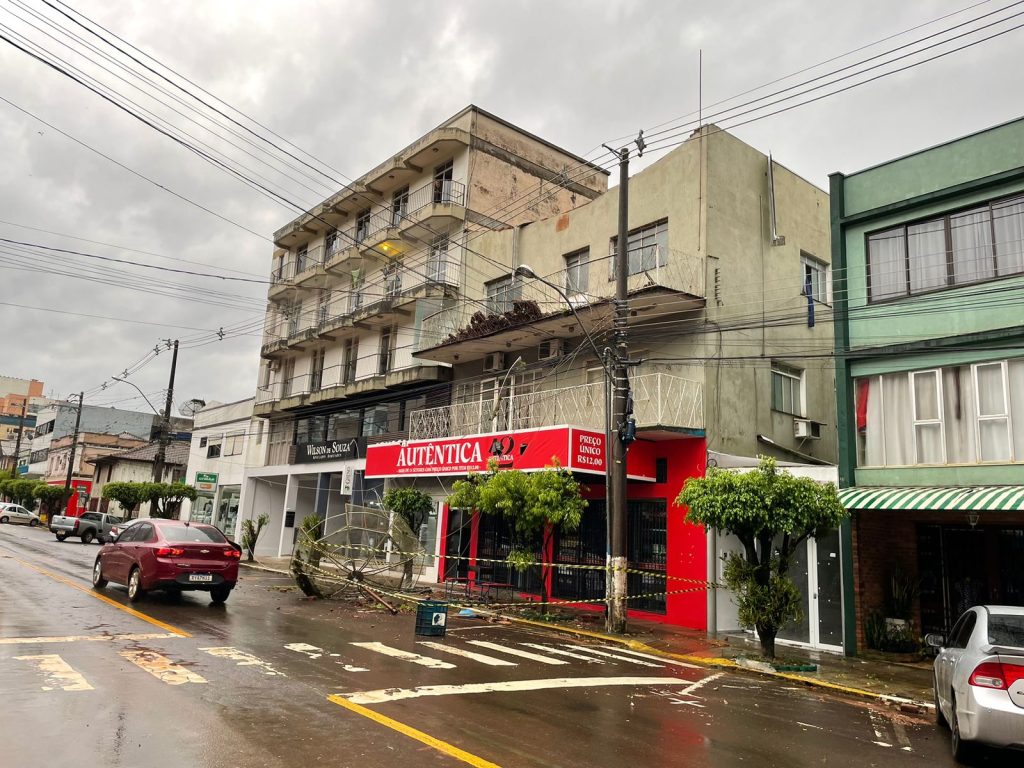Cobertura de prédio no Centro de Seara foi destelhada. Antena parabólica caiu na rua.