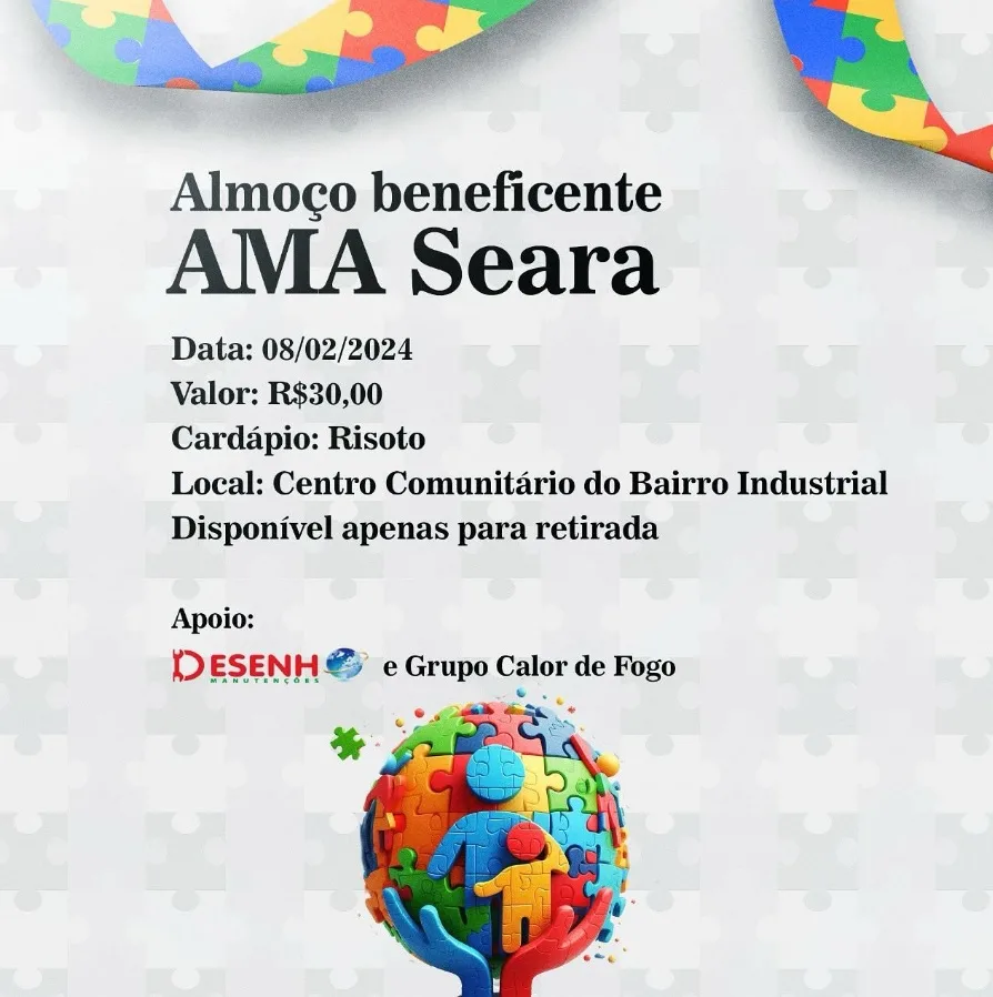 A Associação das Mães, Pais e Amigos dos Autistas de Seara (AMA) promove neste sábado, 8 de fevereiro, um almoço beneficente. O evento acontece no Centro Comunitário do bairro Industrial. As marmitas de risoto estarão disponíveis apenas para retirada no local a partir das 11h30. Ingressos a R$ 30 à venda com os membros da AMA. Todo recurso arrecadado será utilizado na defesa da causa autista.