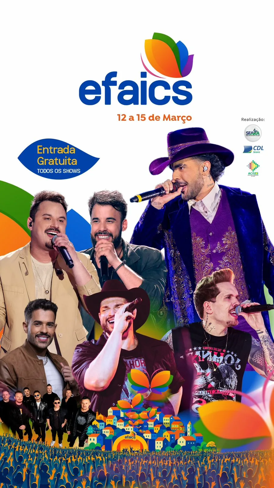 Na sexta-feira, dia 13, duas atrações nacionais. Estarão na Efaics o cantor Bruno Rosa e a dupla Felipe e Rodrigo.