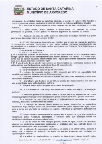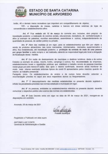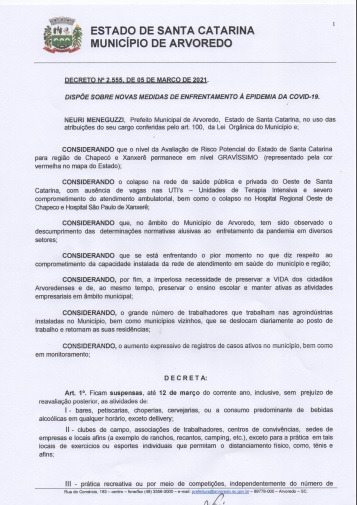 A prefeitura também divulgou nas últimas horas um novo decreto flexibilizando as atividades em Arvoredo.
