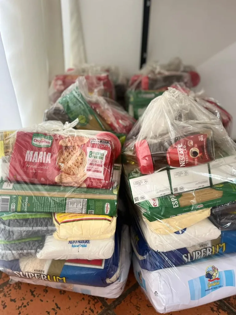 A preparação das cestas foi realizada por mercados locais. Os kits contam com itens essenciais como arroz, feijão, farinha de trigo, açúcar, óleo de soja, macarrão, leite, farinha de milho, café e bolachas.