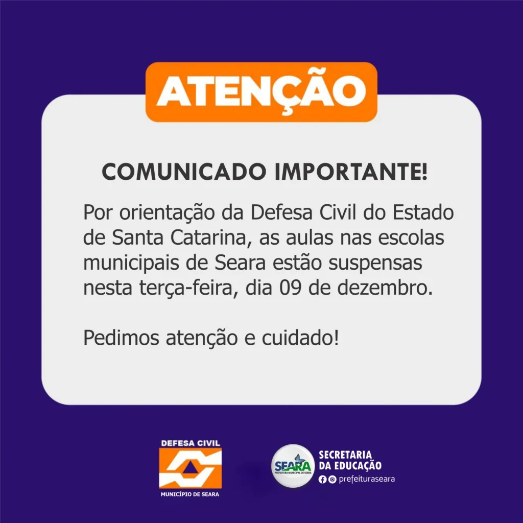 Devido ao alerta de temporais da Defesa Civil, entre a noite desta segunda-feira, 8, e essa terça-feira, 9, as aulas na rede municipal de ensino de Seara serão suspensas nesta terça-feira. O objetivo é preservar a segurança de estudantes, profissionais da educação e suas famílias.