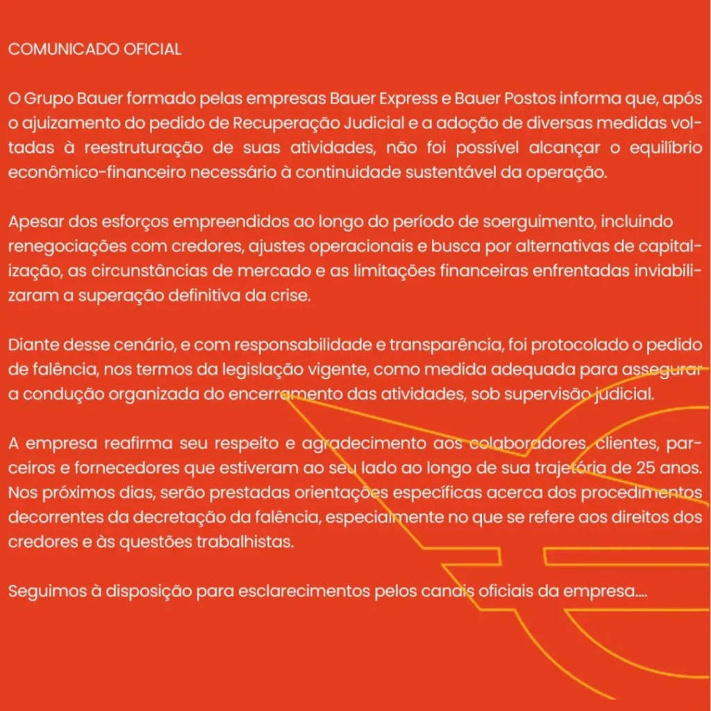 O pedido implica o encerramento definitivo das atividades da Bauer Express, fundada em 2001, com matriz em Chapecó (Santa Catarina), frota superior a 800 veículos, sete filiais próprias e mais de 60 unidades parceiras.