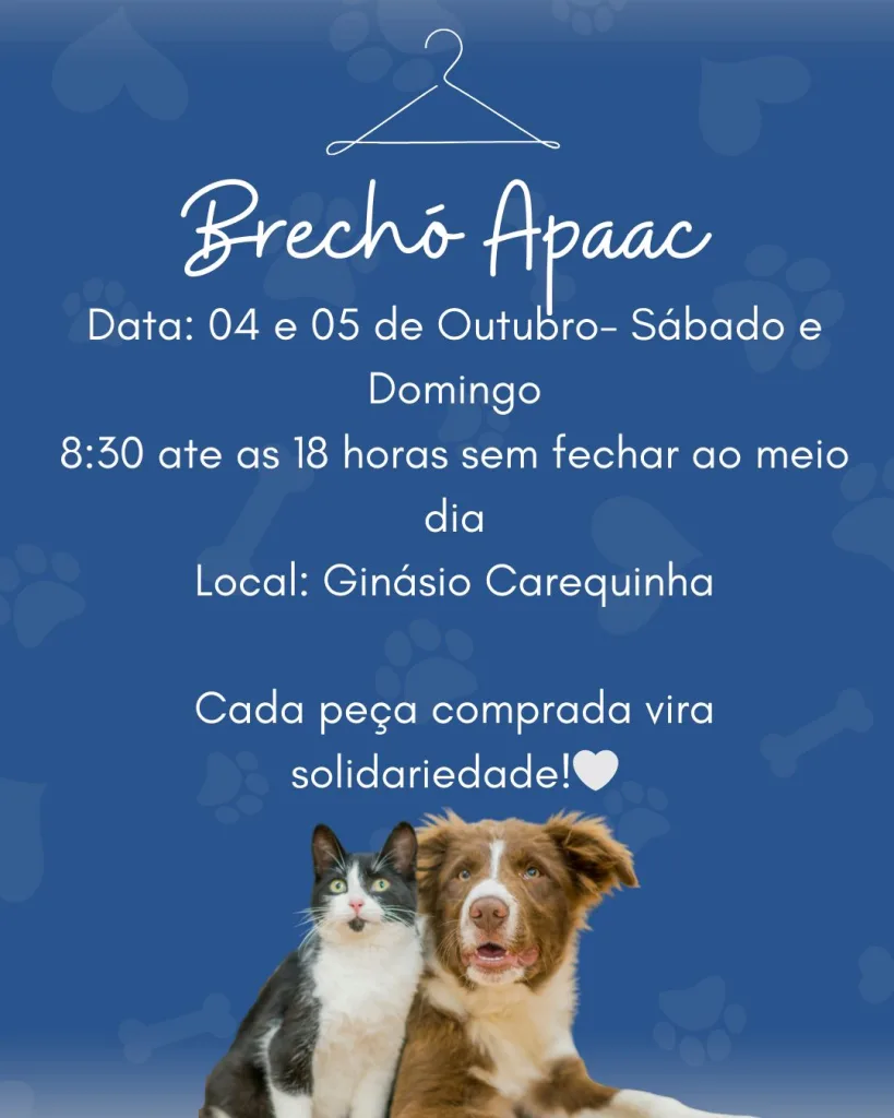 A Associação de Proteção e Auxílio aos Animais de Seara (APAAC) realiza neste domingo um brechó solidário no Ginásio Municipal de Esportes “O Carequinha”, localizado no bairro Industrial.