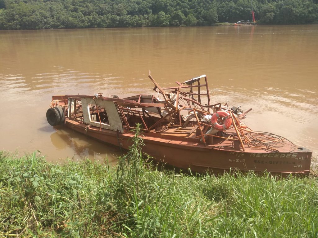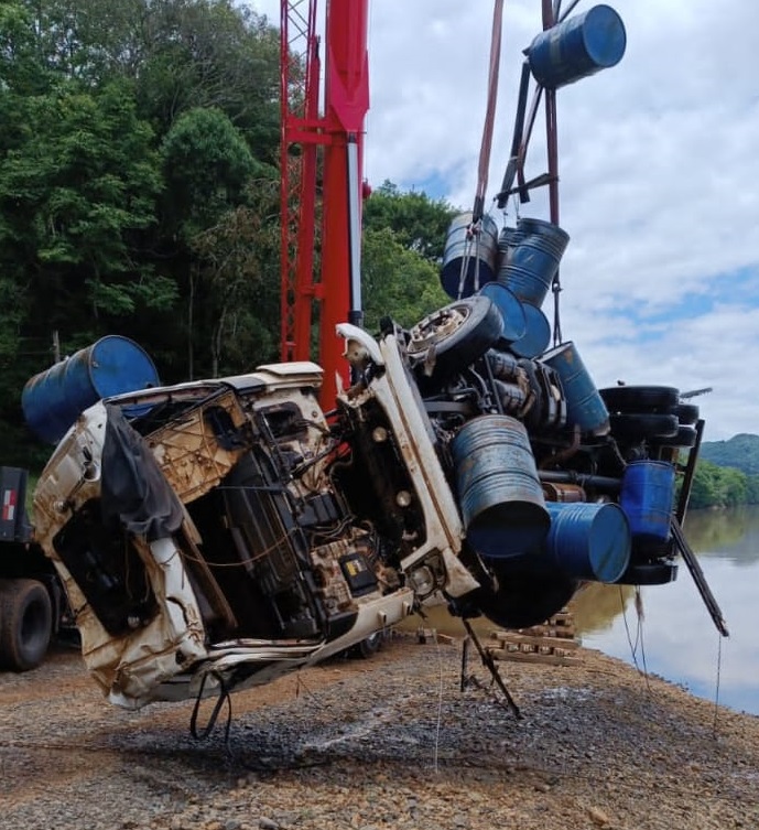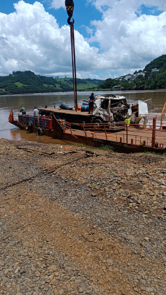 Na manhã desta quarta-feira (29) foram retirados do lago da Usina no Rio Uruguai o caminhão e o rebocador que afundaram com a balsa na travessia Alto Bela Vista/Marcelino Ramos.