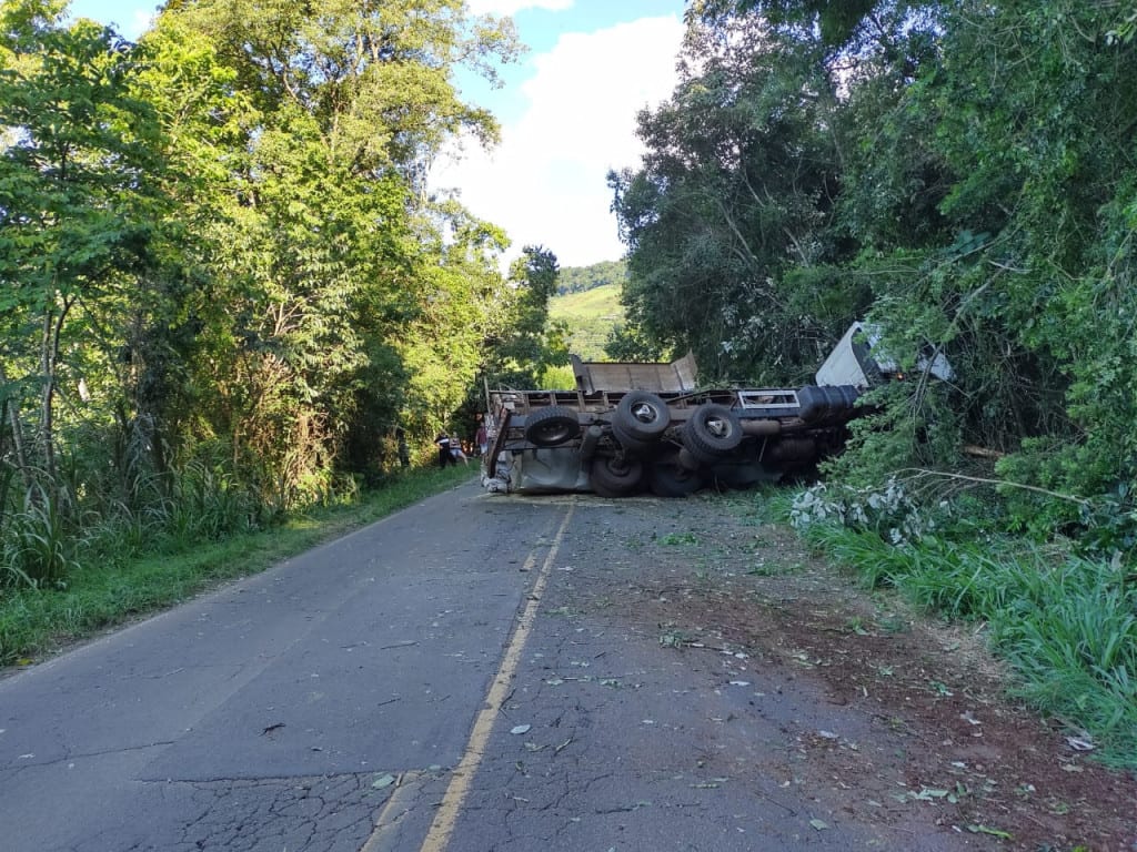Caminhão graneleiro sai da pista e tomba na SC-283 em Arvoredo