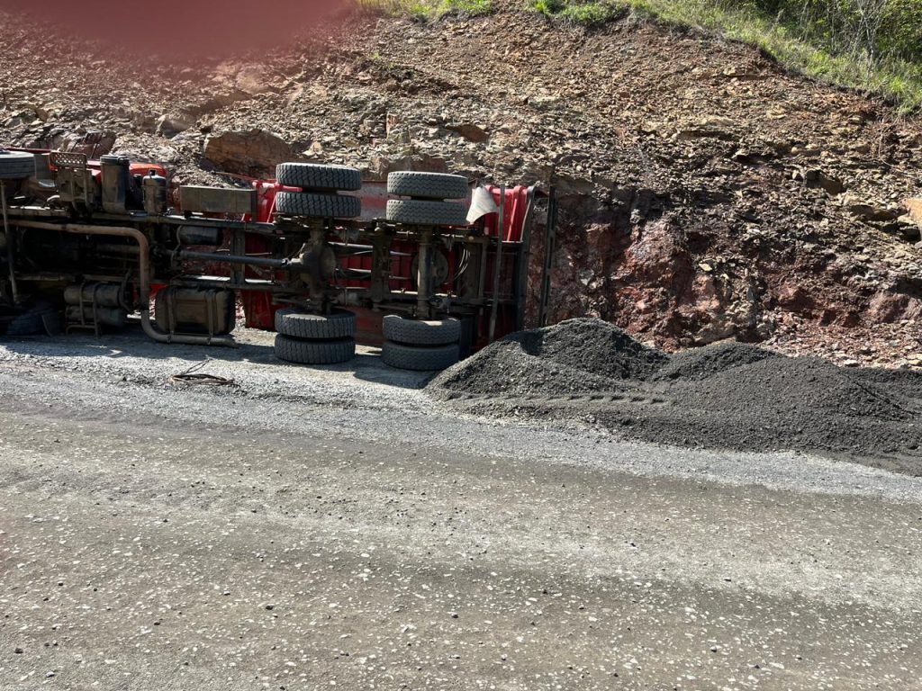 Um caminhão basculante da empresa Planaterra tombou após descarregar uma carga de britas na SC-283, entre Chapecó e Arvoredo, onde acontecem as obras de revitalização da rodovia.