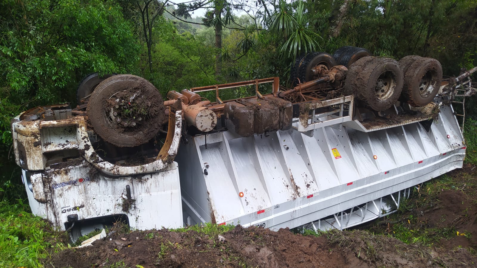 Um caminhão saiu da pista e capotou na BR–282, em Catanduvas, na tarde deste sábado, dia 18. O acidente foi por volta das 16h40. O Corpo de Bombeiros Militar, através do 11º Batalhão, deslocou as viaturas para atendimento ao acidente.