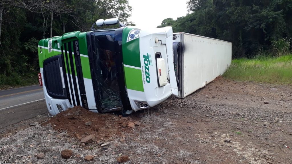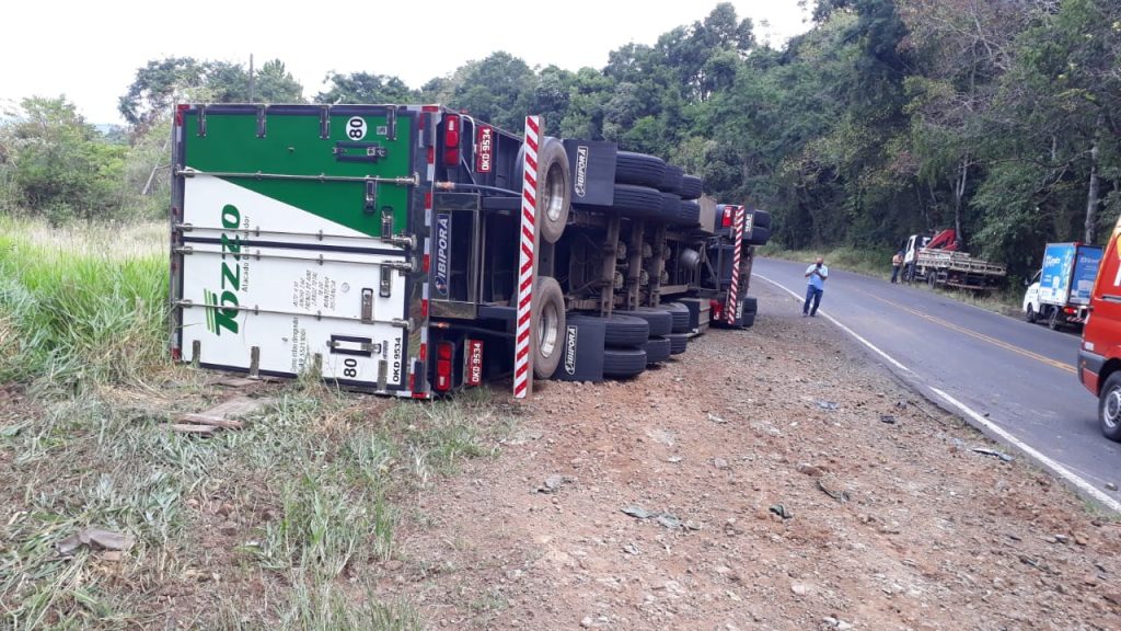 A carreta câmera fria, placas OKD 9534, e o cavalo mecânico placas QJY0103, da empresa Tozzo de Chapecó tombou às margens da pista.