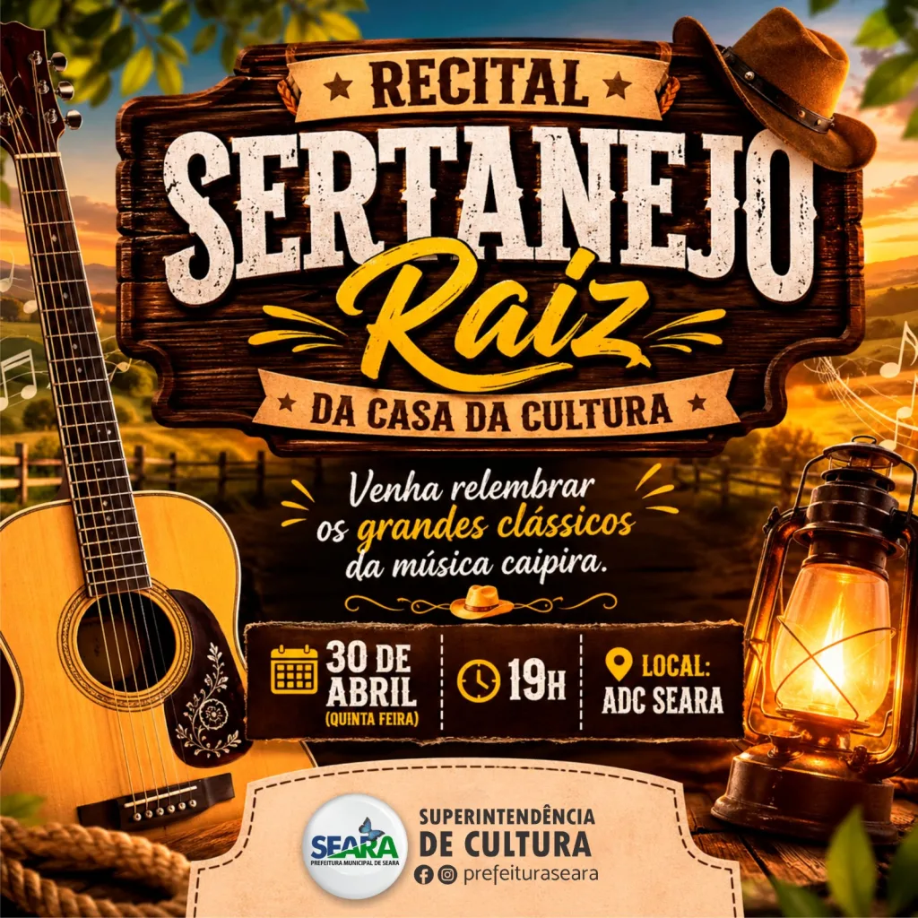 A Superintendência da Cultura convida toda a comunidade para prestigiar o Recital Sertanejo Raiz, que acontece nesta quinta-feira, 30 de abril. O evento contará com 12 apresentações especiais, reunindo cerca de 100 alunos, em uma noite marcada por talento e os grandes clássicos da música sertaneja raiz.