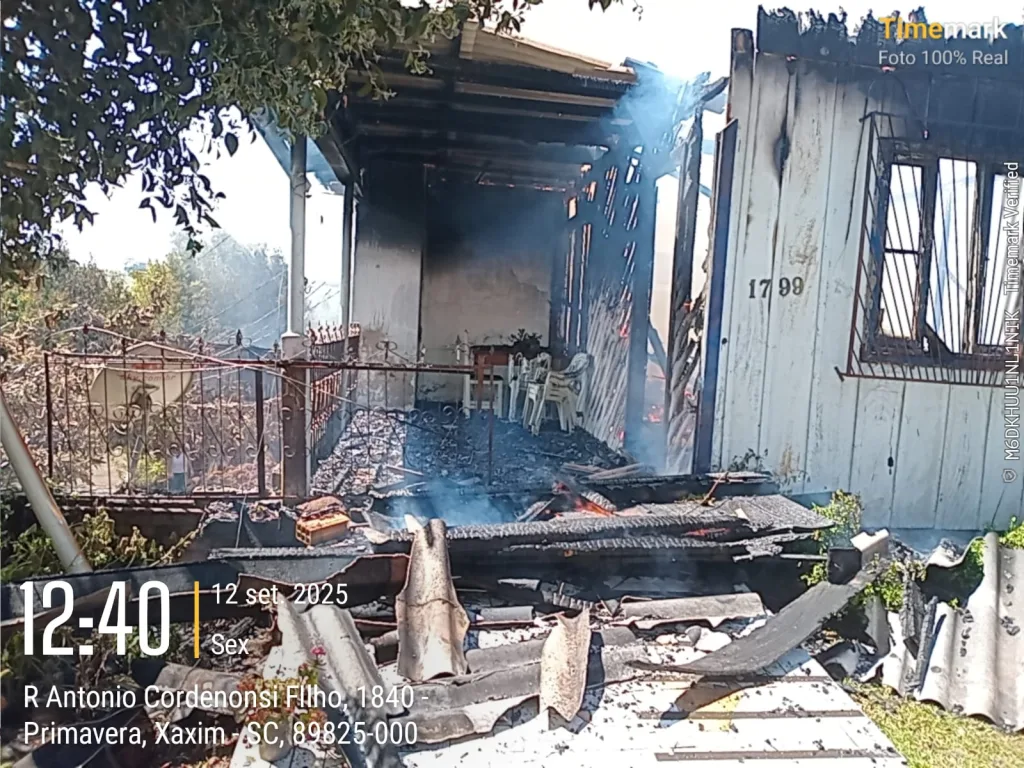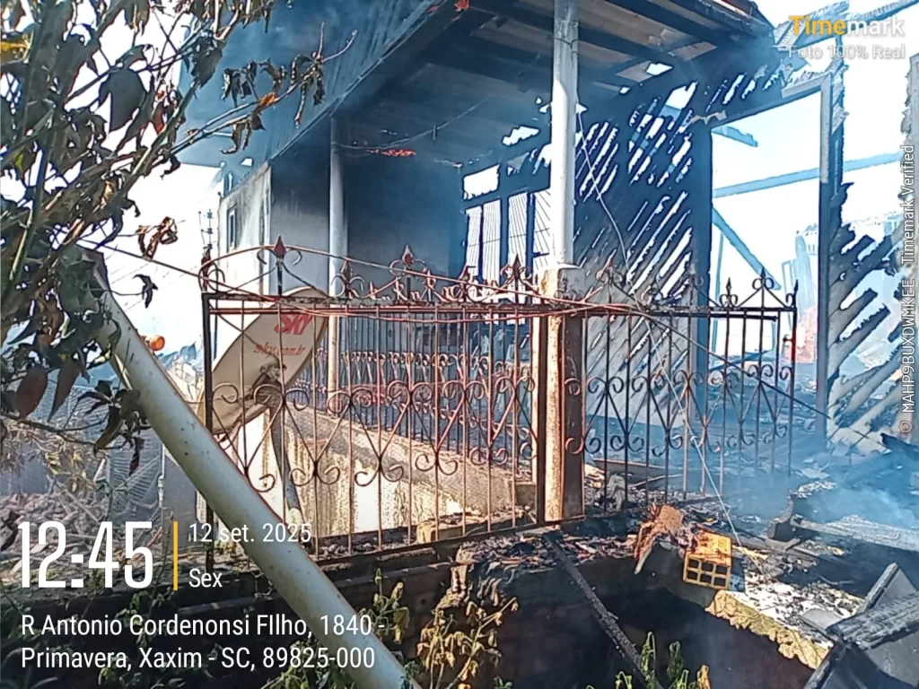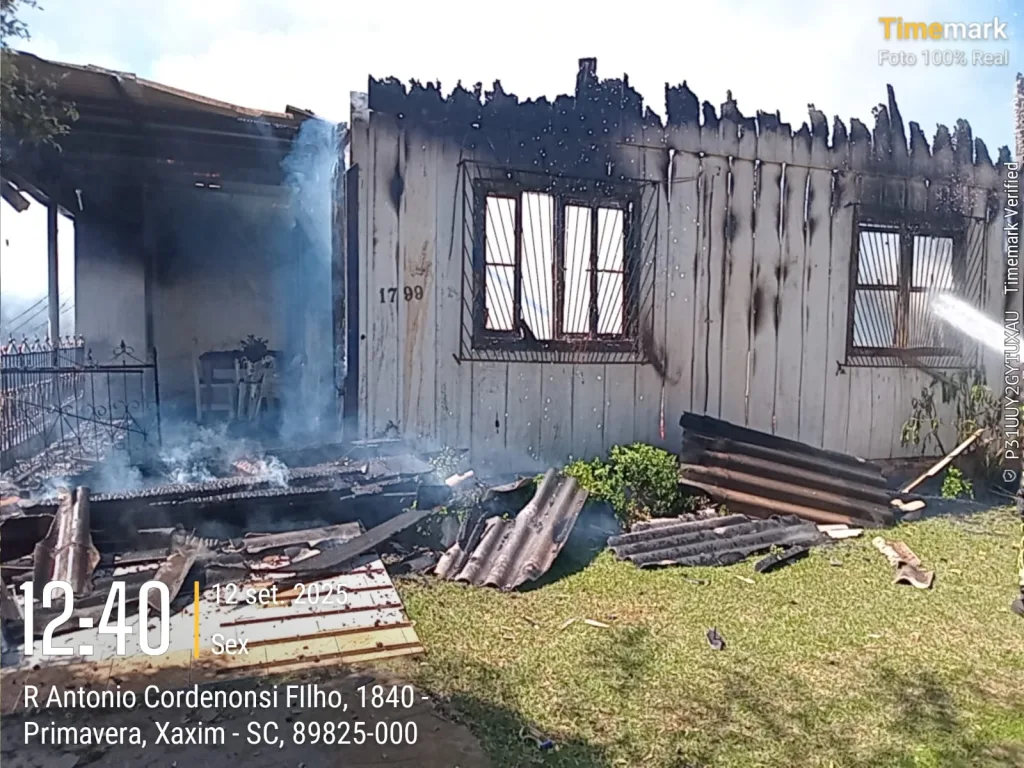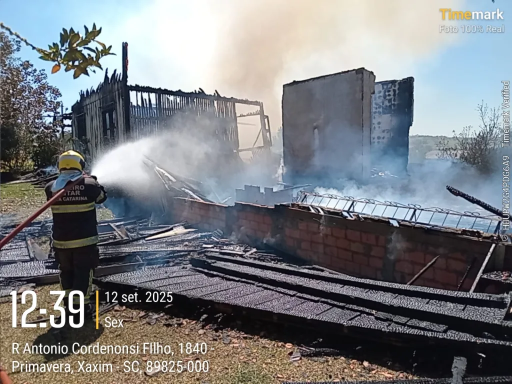 Um incêndio de grandes proporções destruiu uma casa na rua Antônio Cordenonsi Filho, no bairro Primavera, em Xaxim, na manhã desta sexta-feira, 12. O fato foi por volta das 11h45 e mobilizou Bombeiros Militares de Xaxim.
