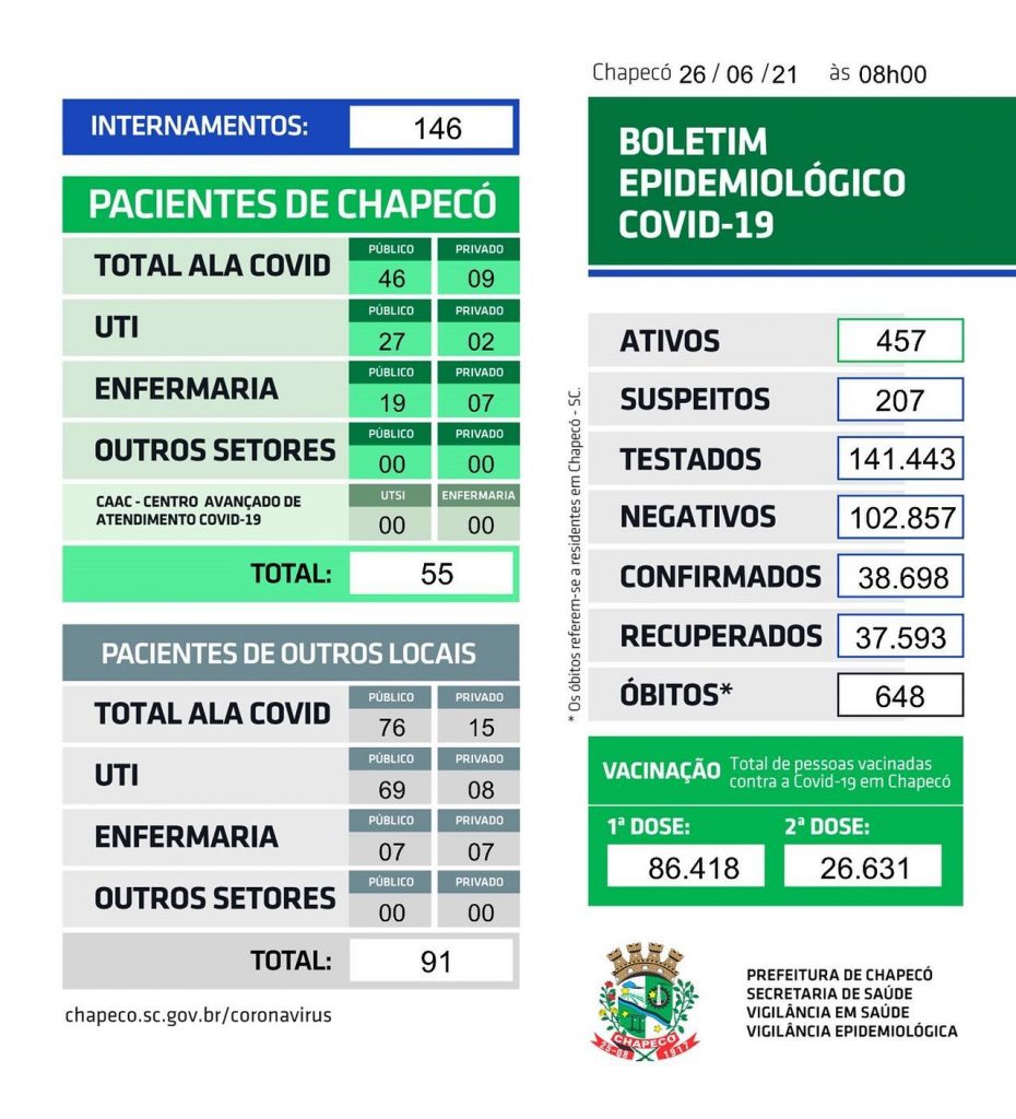 Chapecó registrou mais uma morte em decorrência da pandemia de coronavírus. O óbito ocorreu na última quinta-feira (24), mas a informação foi confirmada pela Administração Municipal em boletim divulgado neste sábado (26).