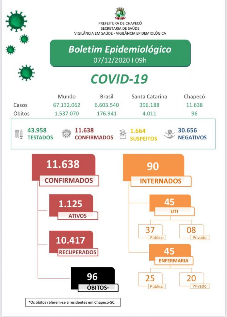 Chapecó chegou a 96 mortes por Covid-19. O dado foi divulgado pela Secretaria de Comunicação do município na manhã desta segunda-feira (07).