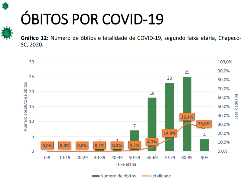 De acordo com o Boletim Epidemiológico Semanal- divulgada na última quarta-feira (4) – com as mortes registradas no município, a taxa de letalidade (relação entre o número de óbitos e o número de pessoas doentes) é de 0,97%. O índice em Santa Catarina é 1,19% e a do Brasil 2,88%.