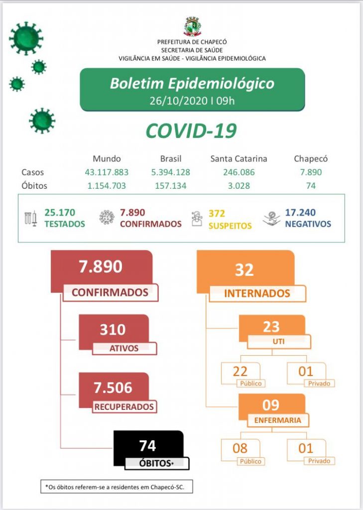A Administração Municipal informou, por meio da Secretaria de Saúde, o 74º óbito causado por Covid-19 em Chapecó.