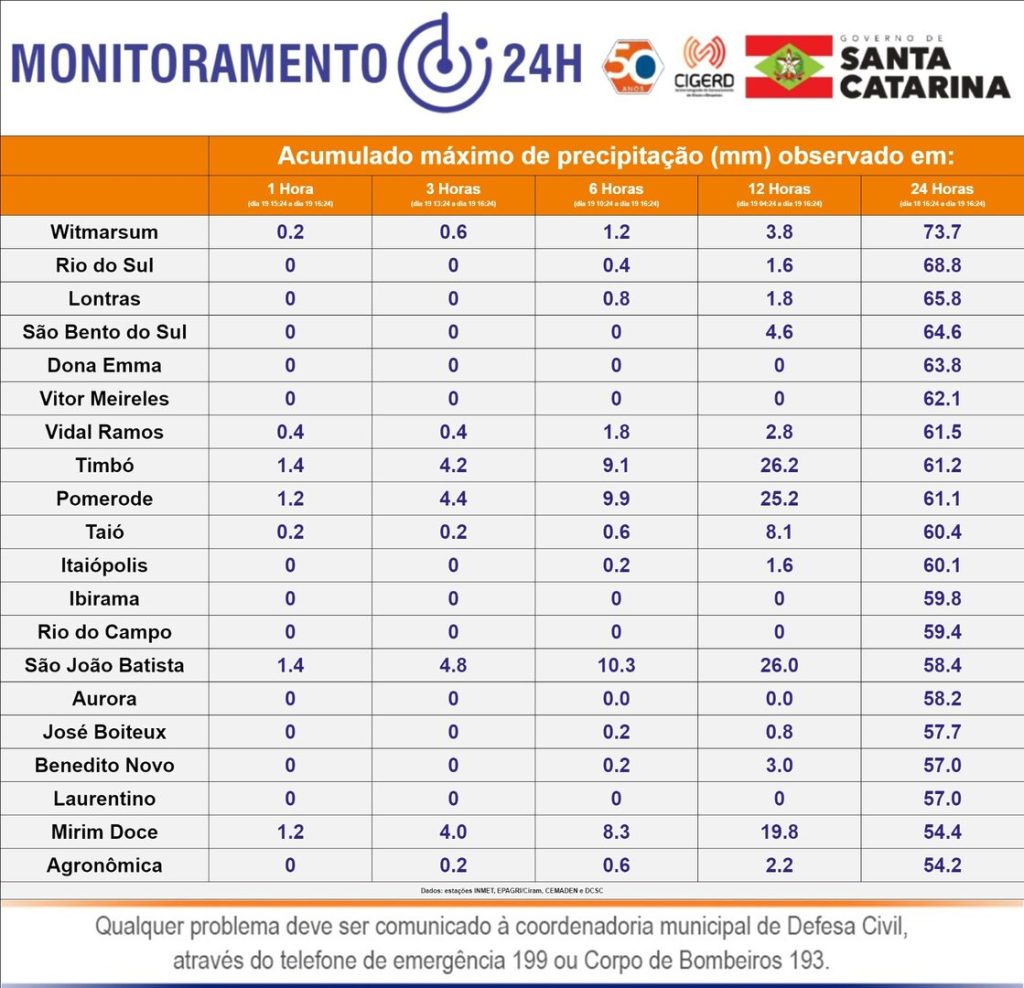Conforme a Defesa Civil, os maiores acumulados de volume de chuva durante o domingo foram de 73.7 milímetros em Witmarsum, 68.8 milímetros em Rio do Sul, 65.8 milímetros em Lontras e 64.6 milímetros em São Bento do Sul.
