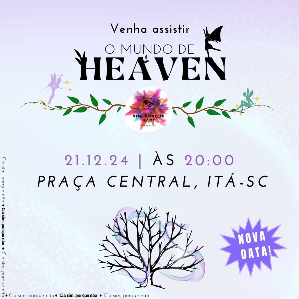 A Companhia Teatral “Sim, Porque Não?” do município de Itá prepara para este sábado, 21, um espetáculo emocionante para toda a família. A peça “Heavaen” falará de amor, perdão e renascimento. Todos os itaenses e visitantes estão convidados a prestigiar o espetáculo que inicia às 20h, na Praça Central de Itá.