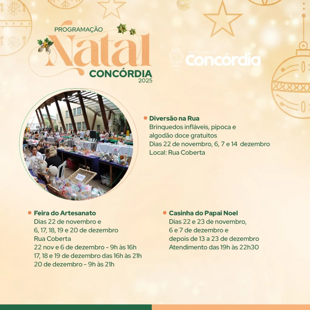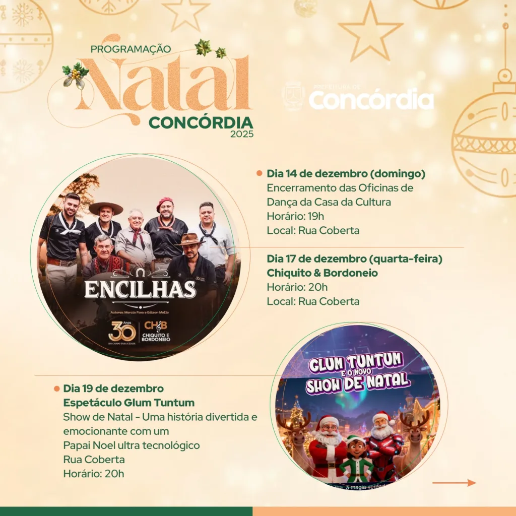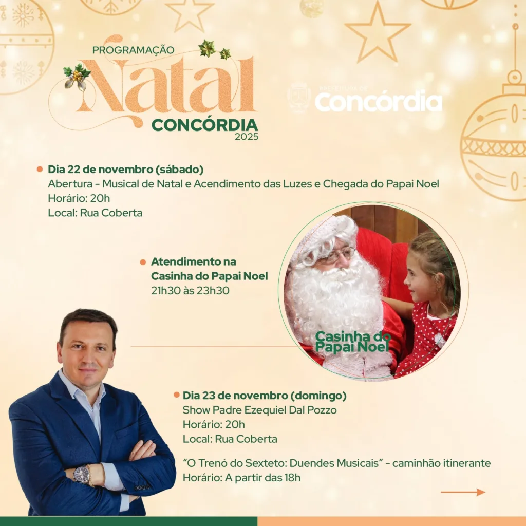 A abertura do Natal Concórdia 2025 acontecerá no próximo sábado, 22 de novembro, a partir das 20h, na Rua Coberta. O Musical de Natal, com acendimento das luzes e chegada do Papai Noel, dará início aos 32 dias da programação natalina promovida pela Administração Municipal.