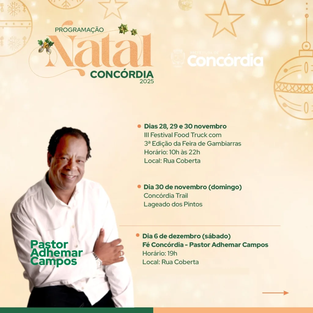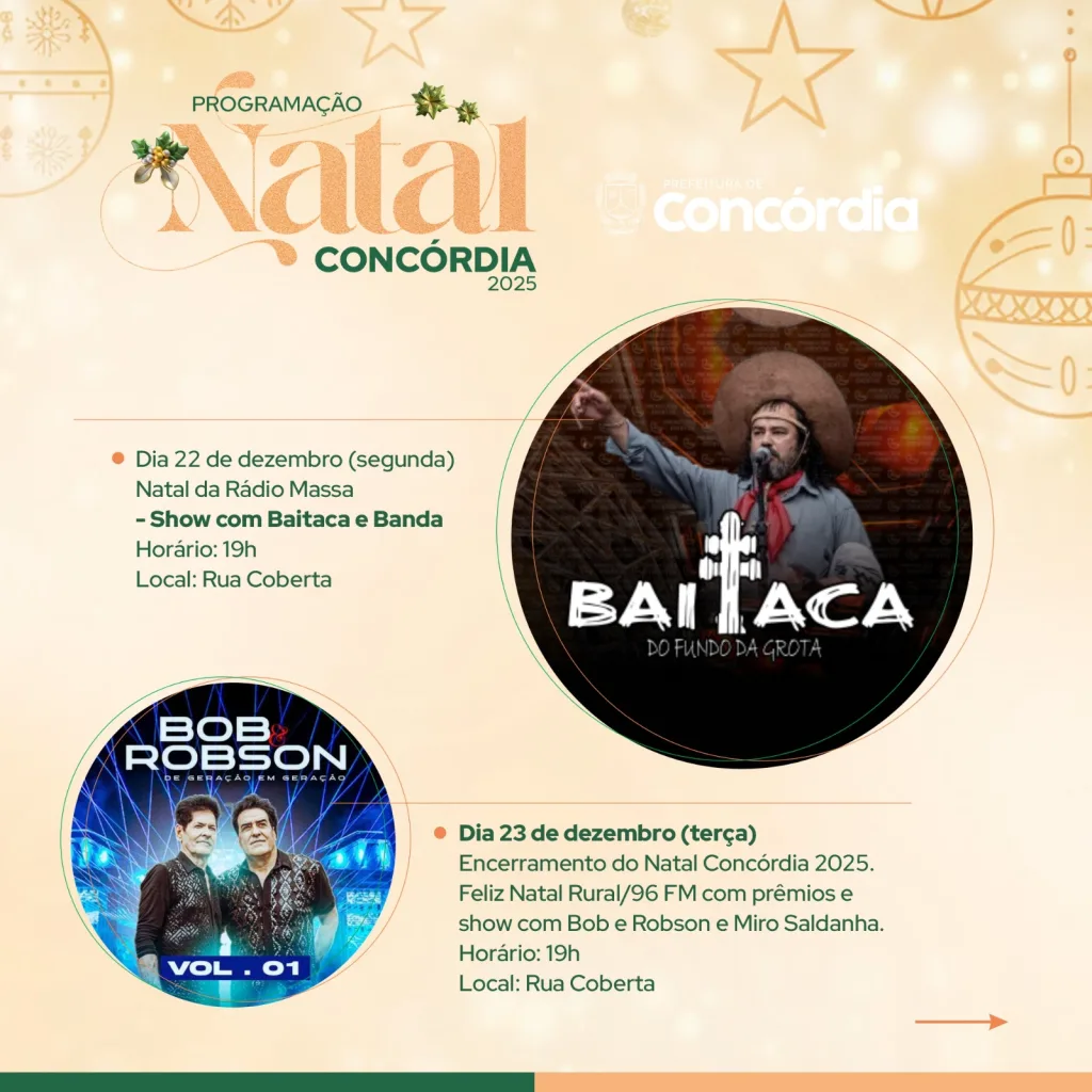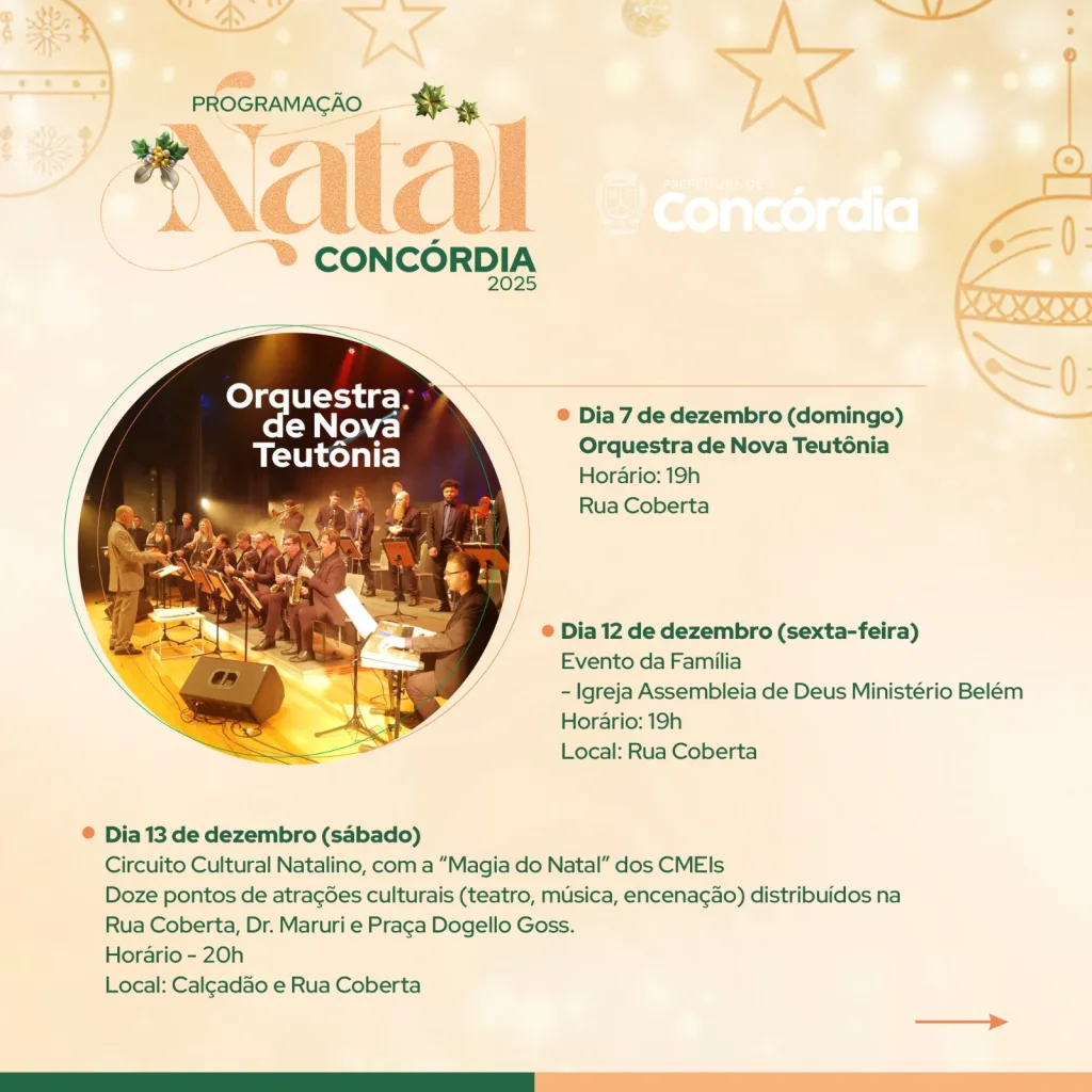 A abertura do Natal Concórdia 2025 acontecerá no próximo sábado, 22 de novembro, a partir das 20h, na Rua Coberta. O Musical de Natal, com acendimento das luzes e chegada do Papai Noel, dará início aos 32 dias da programação natalina promovida pela Administração Municipal.