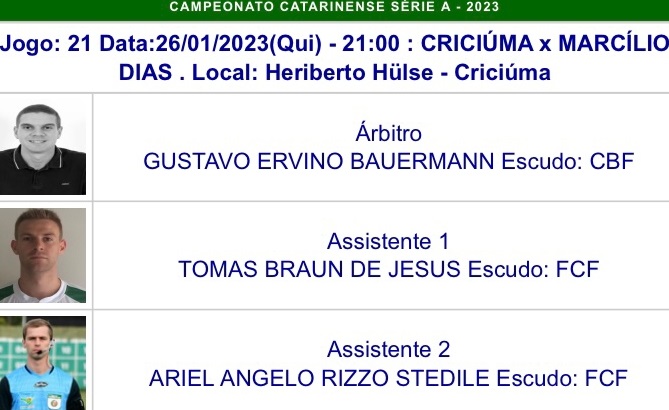 O árbitro auxiliar concordiense Ariel Rizzo acaba de ser escalado para sua primeira partida de série A do Catarinense: é jogo nesta quinta-feira (26) no Heriberto Hülse. Ele estará com o árbitro Gustavo Bauermann (CBF) e o outro bandeira, Tomas de Jesus, no confronto entre Criciúma e Marcílio Dias pela quarta rodada do estadual.