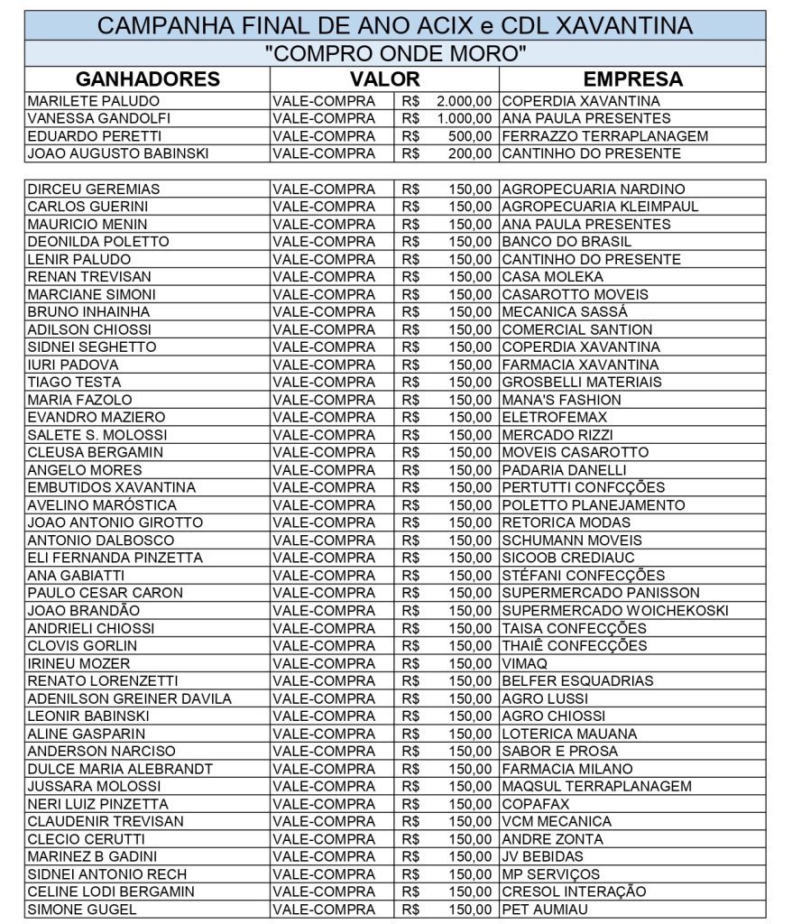 A ACIX e a CDL de Xavantina divulgou os ganhadores da promoção “Compro Onde Moro”. Confira: