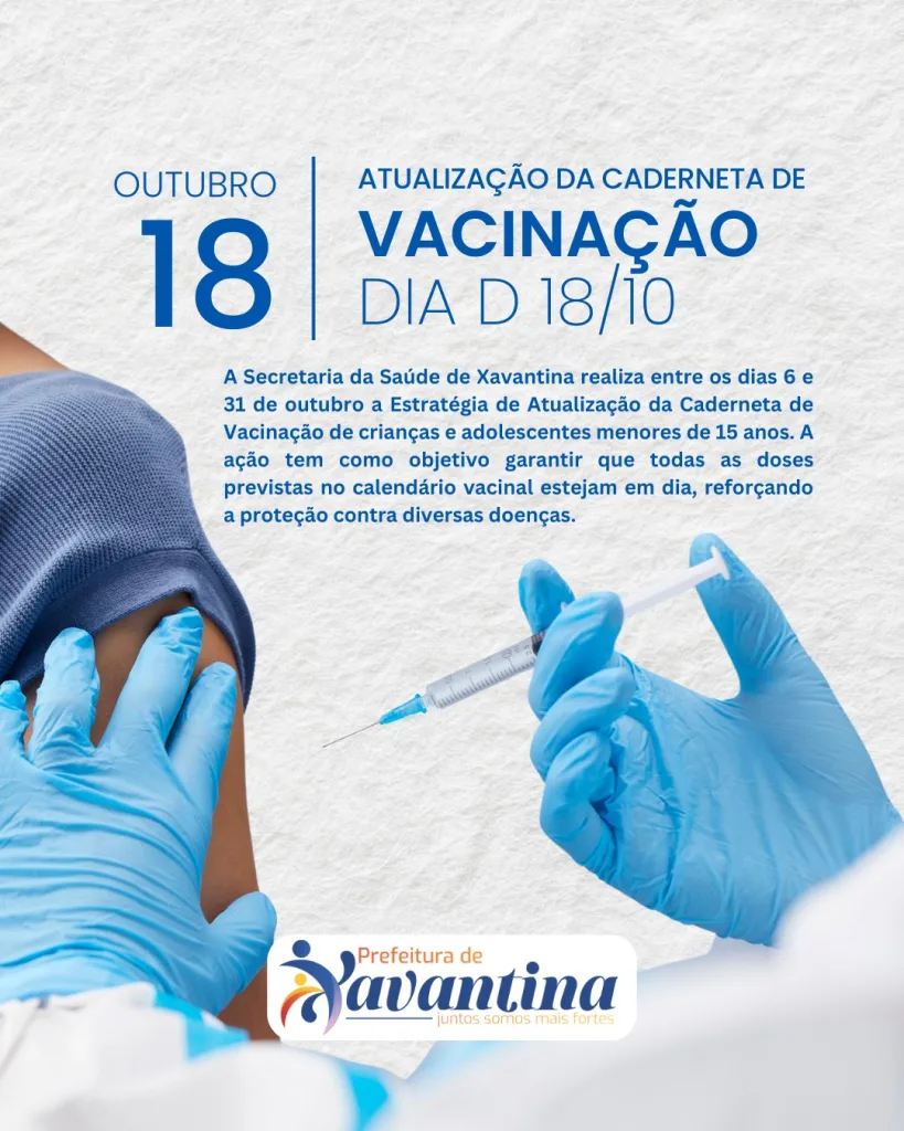 O Dia D da campanha será realizado no sábado, 18 de outubro, das 8h às 17h, com atendimento em todas as unidades de saúde de Xavantina.