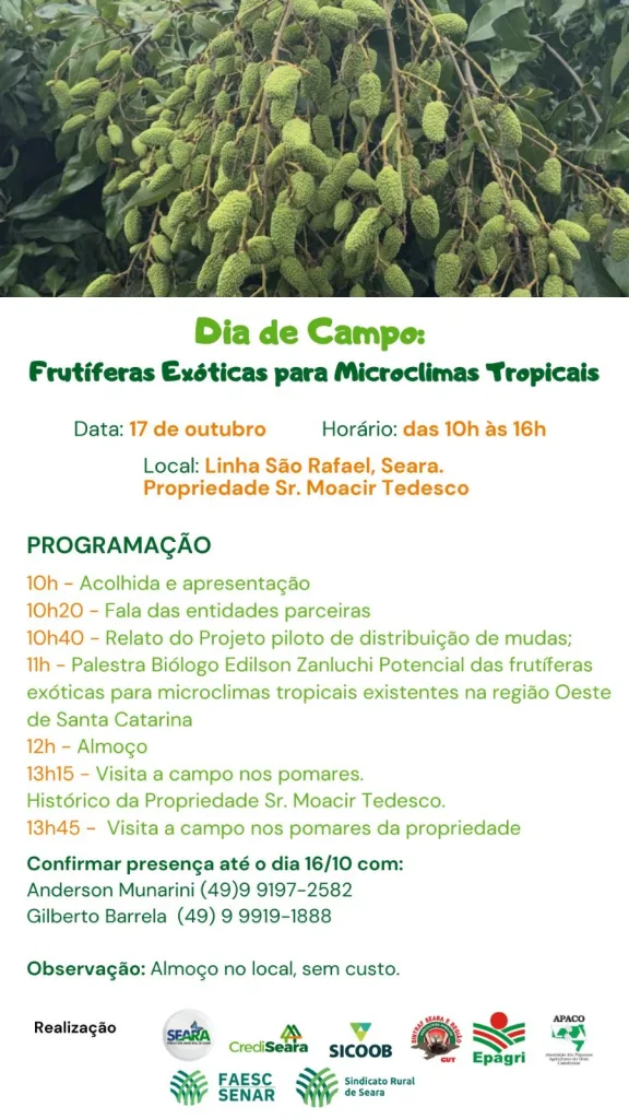 Será realizado nesta sexta-feira, 17, no interior de Seara, o Dia de Campo: Frutíferas Exóticas para Microclimas Tropicais. O evento acontece na propriedade de Moacir Tedesco, em Linha São Rafael. Durante o dia, haverá apresentações e visitas a campo, conhecendo o potencial das frutíferas exóticas para microclimas tropicais existentes na região. Entre as atividades, destaque para a palestra do biólogo Edilson Zanluchi, abordando o potencial das espécies frutíferas para diversificar a produção agrícola.