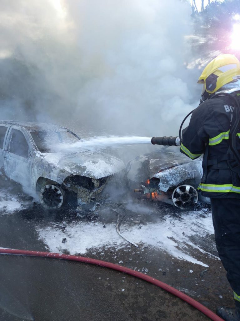 A colisão aconteceu em uma curva e após o acidente os veículos pegaram fogo.