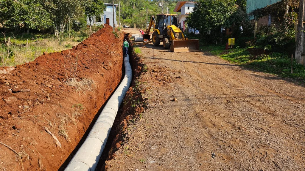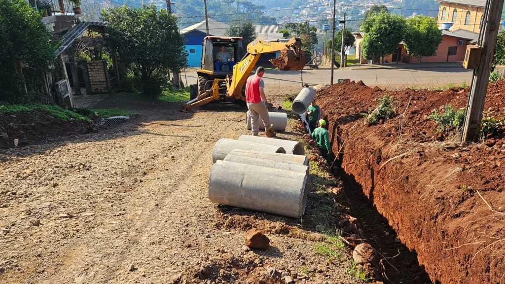 Nesta primeira etapa, estão sendo realizados os trabalhos de tubulação, que garantem o escoamento adequado da água da chuva, preservando a estrutura da via e aumentando a durabilidade da pavimentação.