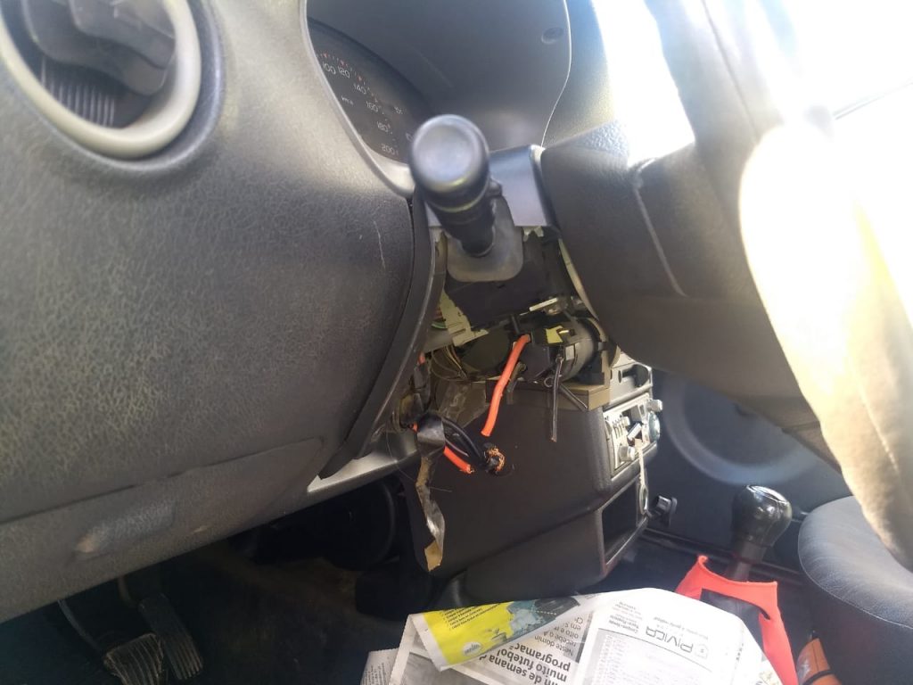 Ainda durante a madrugada os dois ladrões arrombaram um veículo público. Eles danificaram o aparelho de som e cortaram a fiação elétrica para tentar uma ligação direta.