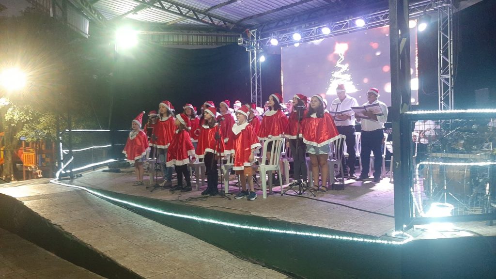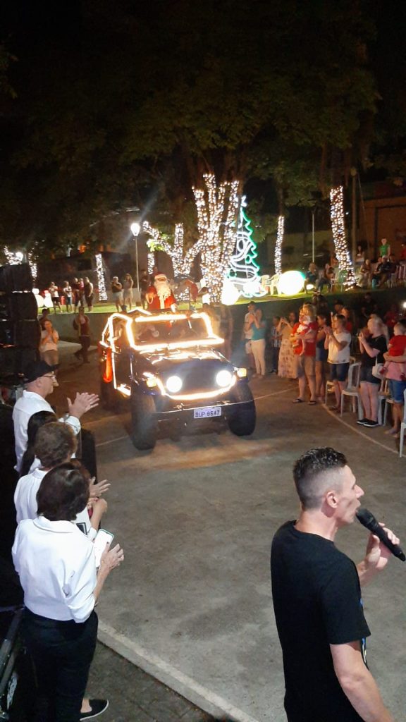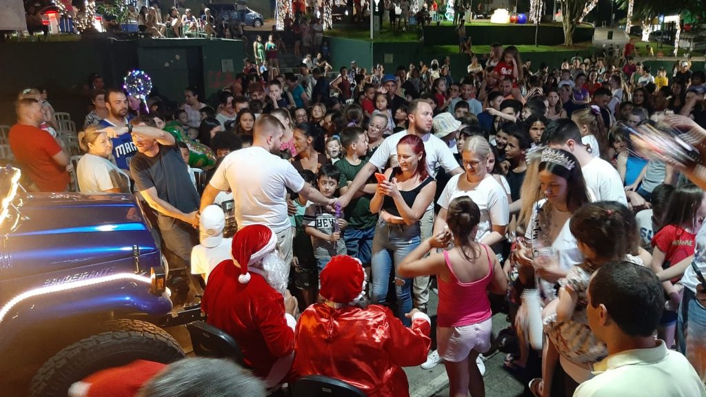 Um grande público prestigiou a chegada do Papai Noel e o espetáculo “Encantos de Natal” na praça Henriqueta Zanuzzo, no bairro São João. O evento aconteceu na noite desta quarta-feira, 20, e levou momentos de emoção, alegria e descontração para as centenas de famílias presentes.