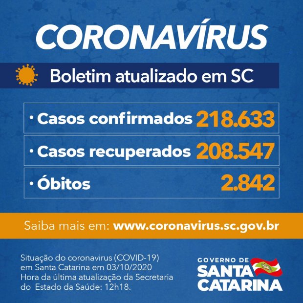 Há em Santa Catarina 218.633 casos confirmados de infecção pelo novo coronavírus, dos quais 208.547 estão recuperados e 7.244 permanecem em acompanhamento. O dado foi divulgado neste sábado, 3. Desde o início da pandemia, 2.842 óbitos foram causados pela doença respiratória. Esses números colocam a taxa de letalidade em 1,3%.