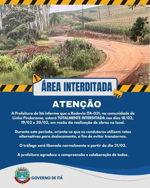Conforme informações da Prefeitura de Itá, a rodovia ITA-031, na comunidade de Linha Pindorama, estará totalmente interditada nos dias 18, 19 e 20 de fevereiro, em razão da realização de obras no local. A orientação é que os condutores utilizem rotas alternativas durante esse período, a fim de evitar transtornos. O tráfego será liberado normalmente a partir do dia 21 de fevereiro.