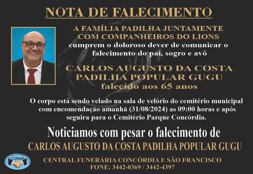 Faleceu às 10h desta sexta-feira, 30, no hospital Izolde Dalmora em Lindóia do Sul, o comunicador e empresário Carlos Augusto da Costa Padilha, aos 65 anos de idade. O corpo de Gugu será velado a partir das 17h, na sala de velório do Cemitério Municipal de Concórdia, com encomendação neste sábado, 31 de agosto, às 9h. O sepultamento será no Cemitério Parque Concórdia.