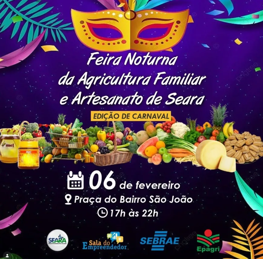 Nesta sexta-feira, 6 de fevereiro, acontece a Feira Noturna da Agricultura Familiar e Artesanato, na praça Henriqueta Zanuzzo em Seara. A partir das 17h haverá a comercialização de produtos coloniais, artesanato, e lanches preparados na hora, como pastel frito e assados, mini pizzas, cachorro quente, sanduíches, porções, suco natural, caldo de cana e chopp artesanal. O tema desta edição é o Carnaval, com apresentações dos professores de música da Casa da Cultura.