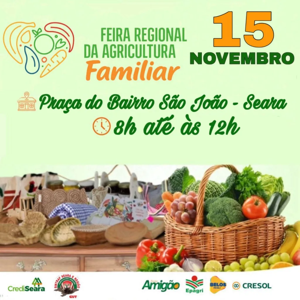 A Feira Regional da Agricultura Familiar acontece neste sábado, 15, das 8h às 12h, na Praça Henriqueta Zanuzzo, em Seara. O evento é tradicional e conta com a comercialização de frutas, verduras, nozes, artesanatos diversos e exclusivos, óleos essenciais, hidrolatos, mudas de flores e chás, geleias, vinhos, mel, panificados, queijos, açúcar mascavo, conservas, farinha de milho, feijão e arroz. Também o Café Colonial, com o pastel e caldo de cana tradicional. É promovido pelo Sintraf e CrediSeara, com apoio da Belos FM, Epagri, Posto Amigão e Cresol.