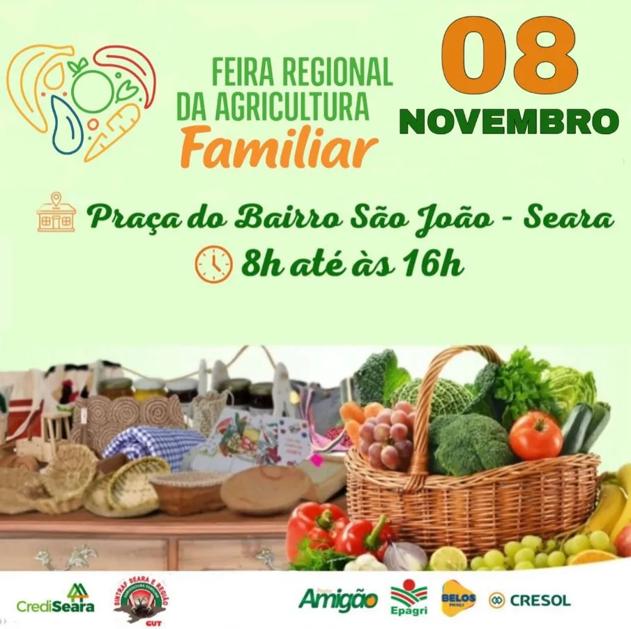 Já no sábado, 8, acontece a Feira Regional da Agricultura Familiar, com início às 8h e encerramento às 16h. Haverá frutas, verduras, nozes, artesanatos diversos e exclusivos, óleos essenciais, hidrolatos, mudas de flores e chás, geleias, vinhos, mel, panificados, queijos, açúcar mascavo, conservas, farinha de milho, feijão e arroz. Também o Café Colonial, com o pastel e caldo de cana tradicional. O evento é promovido pelo Sintraf e CrediSeara, com apoio da Belos FM, Epagri, Posto Amigão e Cresol.