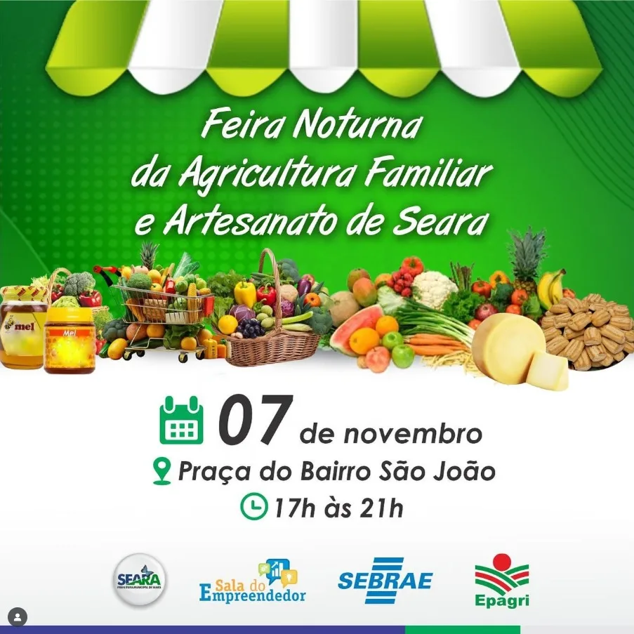 Duas Feiras da Agricultura Familiar acontecem na praça Henriqueta Zanuzzo, em Seara, neste fim de semana. Na sexta-feira, 7, será realizada a 10ª edição da Feira Noturna da Agricultura Familiar e Artesanato com início às 17h e termino às 21h.