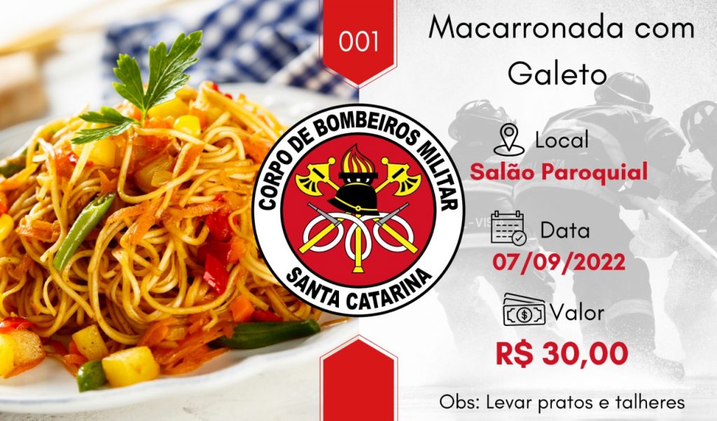 O Corpo de Bombeiros Militar de Itá realiza nesta quarta-feira, feriado de 7 de Setembro, um almoço de Macarronada com Galeto. O evento será no Salão Paroquial.