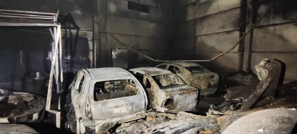 Após o controle das chamas, foi realizado o resfriamento e a ventilação do ambiente. No interior da oficina havia 16 veículos, todos atingidos pelo fogo ou pelo calor — alguns completamente destruídos.