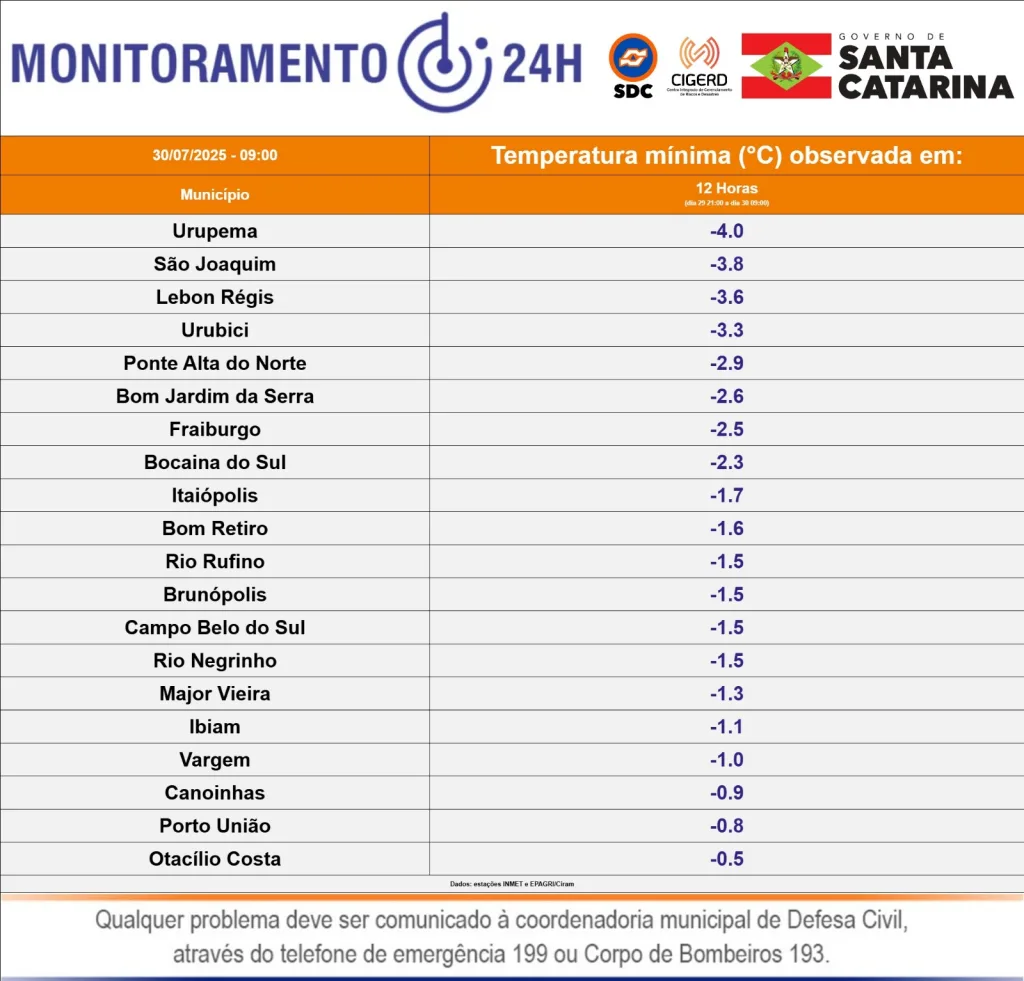 No estado as menores temperaturas forma na serra. Em Urupema, uma das cidades mais frias do país, os termômetros marcaram – 4°C às 7h, segundo a Epagri/Ciram, órgão que monitora as condições de tempo no estado.