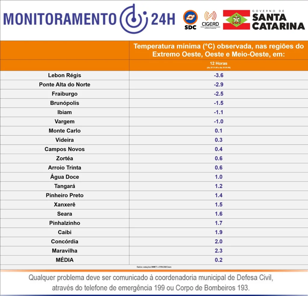 Na região Oeste ainda destaque para o município de Lebom Régis onde fez – 3,6°C e Ponte Alta do Norte com – 2,9°C.