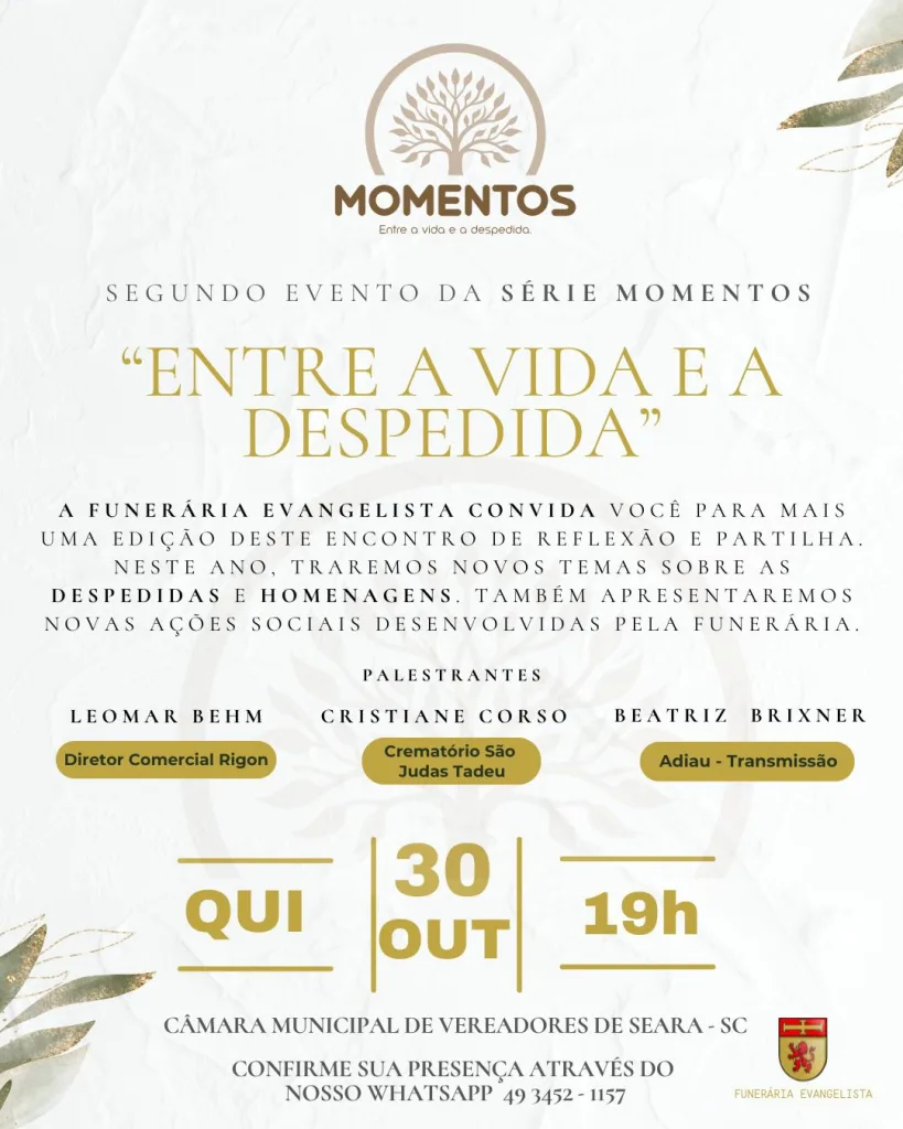 A Funerária Evangelista realiza na quinta-feira, 30 de outubro, o segundo evento da Série Momentos: “Entre a Vida e a Despedida”, que acontecerá no Auditório da Câmara de Vereadores de Seara, a partir das 19h. A iniciativa tem como objetivo promover um encontro de reflexão e partilha, abordando temas relacionados às despedidas e homenagens. Neste ano, o evento trará novos assuntos e experiências, além da apresentação de ações sociais desenvolvidas pela funerária.