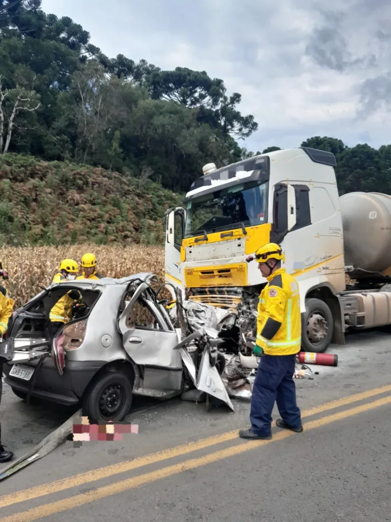 As equipes de resgate encontraram o condutor da carreta consciente e sem lesões, mas os quatro ocupantes do Fiat Palio estavam presos no veículo e sem sinais vitais.